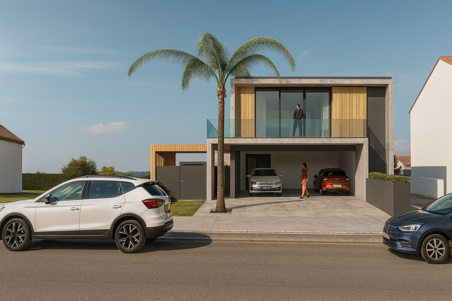 A Moradia afirma-se pela sua estrutura simples e funcional, onde o betão à vista define a essência da construção. Os vãos, em alumínio e vidro, e as portadas, em madeira laminada, encerram o volume criando uma relação equilibrada entre a solidez do betão e a leveza dos materiais naturais. O ripado de madeira introduz ritmo e profundidade às fachadas a sul e poente, através do jogo de luz e sombra que se transforma ao longo do dia.